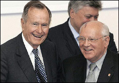 老布什還談到了戈?duì)柊蛦谭蛉ツ暧^看他為慶祝80歲生日而進(jìn)行跳傘時(shí)的情況。他說:“我一落地就看到他在那里等我。他一手拿著一束鮮花,一手拿著伏加特酒。生命在那天是多么的美好。”