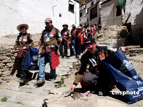 | 5月26日,“2005地球第三極珠峰大行動”志愿者一行,在當?shù)夭孛窈陀慰蛡児餐瑓⑴c下,對位于西藏定日縣境內(nèi)海拔4400米的協(xié)格爾曲德寺進行了清掃和環(huán)保宣傳活動。協(xié)格爾曲德寺創(chuàng)建于1385年,是一座依山而建的古寺。一上午的清掃工作成果頗豐,沿路的山洼里有一些多年無人問津的“死角”,滿是鐵皮手電筒,廢棄電池,鋁制飲料罐等對環(huán)境危害極大的不可降解性垃圾。作者:王驥
