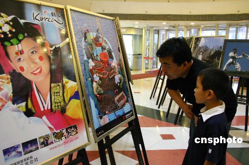 五月二十九日,“中國重慶·韓國友好周”在渝開幕。友好周系列活動(dòng)之一“韓國文化旅游攝影展”在重慶解放碑開展。此次影展主要展示了韓國主要的文化與傳統(tǒng)、自然風(fēng)景、旅游景區(qū)、民俗慶典等一百四十幅攝影作品。圖為一對(duì)父子興致勃勃地觀看影展。作者:郭晉嘉