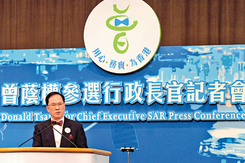 上月二十五日,他以參選特首為由,呈辭政務(wù)司司長一職。今天早上國務(wù)院通過了他的請求。下午,他即舉行正式參選特首記者會。