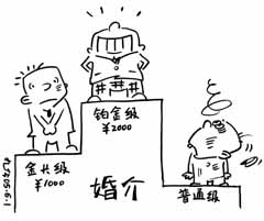 最近,南京出現(xiàn)一家“貴族婚介”,這家機(jī)構(gòu)將會(huì)員分成三個(gè)級(jí)別。首先是鉑金級(jí),要求男性月收入在5000元以上,身高在1.75米以上,學(xué)歷本科以上,相貌端正談吐得體;女性月收入在3000元以上,身高在1.65米以上,學(xué)歷本科以上,漂亮。這個(gè)級(jí)別的會(huì)員年費(fèi)為2000元。其次是金卡,要求男性月收入在3000元,身高難1.72米,本科;女性月收入1500元,身高1.62米,大專。這個(gè)級(jí)別的年費(fèi)是1000元。最后是普通止背,不管男女,只要求收入在1000以上。按照規(guī)則,“上級(jí)”會(huì)員可以查看并約見“平級(jí)”和“下級(jí)”會(huì)員,“下級(jí)”會(huì)員去不能約見“上級(jí)”會(huì)員。這家“貴族婚介”的人員介紹,他們之所以將會(huì)員分級(jí),目的只是想提高成功率。“我們并不是阻礙自由戀愛,但既然大家求助于婚介,借助一些社會(huì)上的潛規(guī)則有利于提高成功率。”