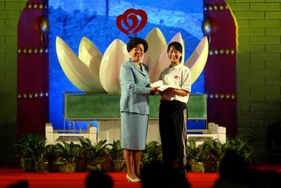 羅格、劉淇在儀式之初共同為北京奧運(yùn)會(huì)志愿者標(biāo)識(shí)揭幕。羅格、劉淇端起中國(guó)古代盛大慶典禮儀活動(dòng)時(shí)的用具——匜(音yi),向“花池”上方的“水立方”中澆水,“花蕾”緩緩開(kāi)放,“花蕾”中央的北京奧運(yùn)會(huì)志愿者標(biāo)識(shí)模型徐徐升起。