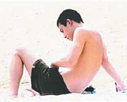 據(jù)報導,陳冠希上周三(6月1日)下午4點左右,他一個人到香港淺水灣的海灘做日光浴,先是從手提袋中拿出一大條白毛巾、防曬油,然后開始脫掉背心,涂防曬油,涂完防曬油就躺在毛巾上曬太陽,后邊打電話邊抽煙,優(yōu)閑地享受日光浴。