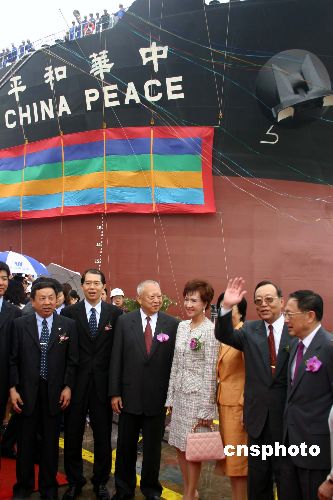 臺(tái)灣船東直接在祖國(guó)大陸訂造的第一艘船“中華和平”號(hào)十日在滬舉行盛大的命名交船儀式,圖為全國(guó)政協(xié)副主席董建華、中國(guó)國(guó)民黨主席連戰(zhàn)夫人連方瑀女士等專(zhuān)程趕來(lái)見(jiàn)證海峽兩岸這一重要的歷史性時(shí)刻,并在“中華和平”號(hào)前合影留念。作者:孫自法