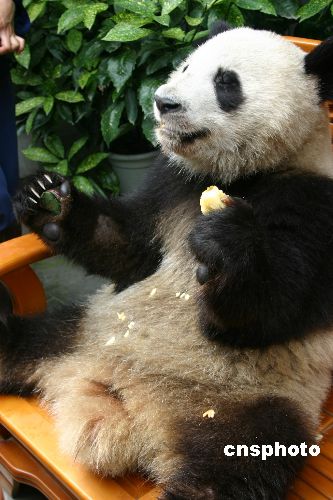 端午節(jié)將臨,6月10日上午,成都大熊貓繁育研究基地工作人員為大熊貓準(zhǔn)備了特殊的節(jié)日禮物:削成粽子形狀的蘋果。兩歲的大熊貓“成仔”正在盡情享用這份節(jié)日大餐。作者:楊杰