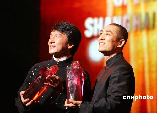 中新社上海六月十一日電(記者孫璐)第八屆上海國(guó)際電影節(jié)今晚在上海大劇院正式拉開(kāi)帷幕。在電影節(jié)開(kāi)幕式上第一個(gè)頒發(fā)的也是最有份量的獎(jiǎng)項(xiàng)——“華語(yǔ)電影杰出貢獻(xiàn)獎(jiǎng)”,由享譽(yù)海內(nèi)外影壇的著名導(dǎo)演張藝謀和影星成龍雙雙獲得。