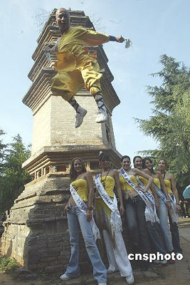 六月十二日,參加二○○五國際旅游小姐冠軍總決賽的來自七十五個國家和地區(qū)的旅游形象大使,齊聚河南省登封市著名的少林寺,繼續(xù)中國大陸之旅第二站河南巡游,少林寺內的中國功夫表演吸引了來自各國的佳麗們。作者:盛佳鵬