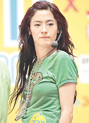 昨天柏芝穿上綠色T恤襯低腰褲作hip hop打扮,跳舞時(shí)卻配上“特別效果”,胸前出現(xiàn)“凸點(diǎn)”現(xiàn)象之余,黑色內(nèi)褲邊也隨著拍子頻頻曝光。柏芝更是語(yǔ)出驚人,在與fans跳舞時(shí),她竟向fans說(shuō):“你用下面(下半身)頂住記者就得!笔植晃。當(dāng)她唱《新聞女王》時(shí),有人假扮狗仔隊(duì)偷拍她,柏芝就用屁股把他頂開。