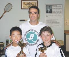 中新網(wǎng)6月13日電 據(jù)世界日報報道,華裔兒童莫小虎(前左)日前參加美國網(wǎng)球協(xié)會于紐約布魯克林舉行的美東區(qū)冠軍賽,獲得10歲組冠軍,圖為莫小虎與第二名的柯恩(前右)獲獎后與教練合影。(《世界日報》梁起華)