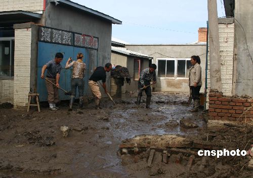 圖:洪水過(guò)后沙蘭鎮(zhèn)居民清理門(mén)前淤泥