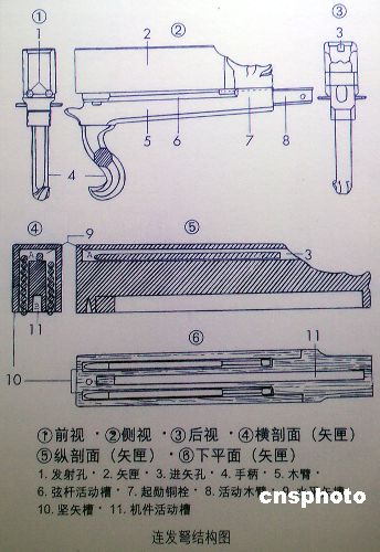 弩機(jī)示意圖。弩機(jī)是具有遠(yuǎn)射和殺傷力較強(qiáng)的武器,它的構(gòu)造分矢匣和機(jī)體兩部分。機(jī)件為銅質(zhì),矢匣用楠木雕制,呈長方形,前端下緣有兩個(gè)并列的半圓形發(fā)射孔。匣內(nèi)有三個(gè)儲(chǔ)存矢的槽,兩側(cè)為豎槽,可儲(chǔ)矢九枝,中間為水平槽,可并列放置二內(nèi)。?