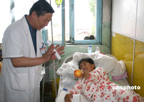 截至六月十四日,在黑龍江寧安特大山洪災(zāi)害中被救出的十七名學(xué)生已基本康復(fù)。但學(xué)生心中仍存恐懼與陰影,為此醫(yī)生通過(guò)聊天、玩游戲等方式對(duì)學(xué)生進(jìn)行心理疏導(dǎo)。圖為一名學(xué)生聽(tīng)完專家的笑話,高興地將蘋果送給專家。作者:吳兆飛