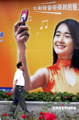 6月16日,上海一手機用戶正打手機經(jīng)過中國電信小靈通彩鈴手機廣告。統(tǒng)計顯示:中國手機用戶彩信彩鈴使用率大幅提高。作者:吳芒子