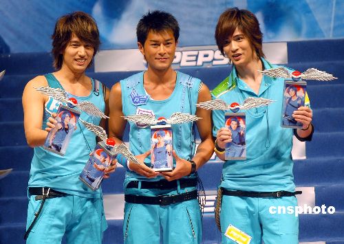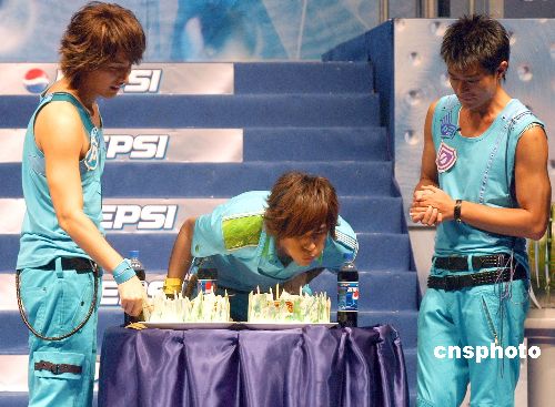 中新網(wǎng)6月17日電 據(jù)香港媒體報道,古天樂、言承旭(Jerry)及周渝民(仔仔),前晚一身藍(lán)色裝扮,出席《百事藍(lán)色風(fēng)暴615公告首部曲》記者會,吸引了五百歌迷捧場,場面熱鬧。由于仔仔上周四生日,古仔及Jerry特別送上蛋糕慶祝,Jerry更當(dāng)場飛擒咬吻仔仔。至于仔仔的生日愿望,則是身體健康、支持F4、古天樂及百事。