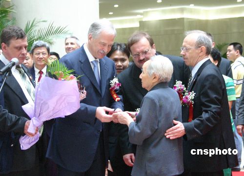 六月十八日,俄羅斯國(guó)家杜馬主席格雷茲洛夫出席了重慶市直轄八周年紀(jì)念活動(dòng)和《紀(jì)念二戰(zhàn)勝利六十周年圖片展》開幕式,并參觀了蘇軍烈士紀(jì)念墓和原蘇聯(lián)大使館重慶舊址。圖為格雷茲洛夫(左二)向東北抗日聯(lián)軍老戰(zhàn)士胡真一女士(右二)頒發(fā)“偉大的衛(wèi)國(guó)戰(zhàn)爭(zhēng)勝利六十周年紀(jì)念章”。作者:郭晉嘉