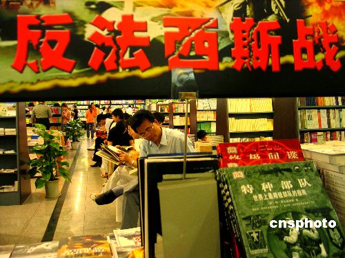 6月18日,南京某書城為紀念中國抗日戰(zhàn)爭暨世界反法西斯戰(zhàn)爭勝利60周年,在店堂內設立了反法西斯戰(zhàn)爭主題書展,受到讀者歡迎,每天都吸引百余位讀者。作者:鐘山