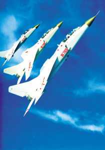 1999年10月1日,“飛豹”以壯美的雄姿第一次在全國人民面前莊嚴(yán)亮相:6機(jī)箭形編隊(duì)以“不偏一米、不差一秒”的驕人成績準(zhǔn)確通過天安門上空,接受了黨和人民的檢閱,創(chuàng)下了參閱機(jī)型最新、改裝時(shí)間最短、飛行密度最大、編隊(duì)難度最高、閱兵航程最遠(yuǎn)5項(xiàng)記錄。