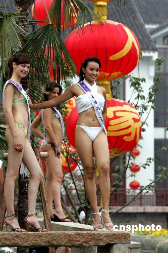 六月二十二日,參加二零零五年國際旅游小姐大賽的佳麗們身著泳裝在水鄉(xiāng)周莊亮相拍照。作者:毛建軍