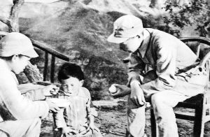 在一陣炮火之后,我與連長(zhǎng)韓金銘、四班長(zhǎng)和衛(wèi)生員小李沖進(jìn)山下的碉堡。這時(shí)里面還冒著硝煙,我們看到幾具日軍的尸體橫在地上,其中一具是日本婦女。使大家驚奇的是,在她的身邊有一個(gè)大約5歲左右的小姑娘木然地站在那里,用恐懼的目光呆呆地望著我們。大家斷定,這是敵人的家屬,是個(gè)無辜的孩子。這時(shí)車站的敵人還一個(gè)勁兒地向碉堡射擊。連長(zhǎng)馬上命令我:“快把這小孩護(hù)送到營(yíng)部的救護(hù)所去!”我抱起小姑娘,迅速地撤離了碉堡,沿交通壕往回返。