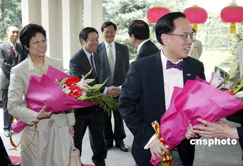自動(dòng)當(dāng)選并獲中央政府任命的香港特別行政區(qū)行政長官曾蔭權(quán)(右一)和夫人、前往機(jī)場迎接的國務(wù)院港澳辦副主任陳佐洱(左三),六月二十三日中午抵達(dá)北京釣魚臺(tái)國賓館。曾蔭權(quán)將于二十四日參加在人民大會(huì)堂舉行的宣誓就職儀式。作者:盛佳鵬