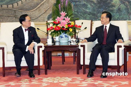 今天上午九時十五分許,在人民大會堂香港廳簡單隆重的宣誓就職儀式結(jié)束后,溫家寶總理在接待廳會見了曾蔭權(quán)。