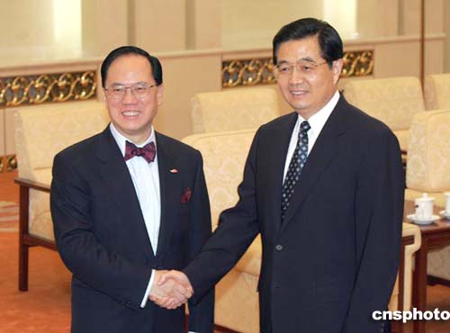 國家主席胡錦濤今天下午在會見香港特別行政區(qū)行政長官曾蔭權(quán)時,希望曾蔭權(quán)先生不負(fù)眾望,恪盡職守,奮發(fā)進取,為香港的繁榮穩(wěn)定和發(fā)展作出新貢獻。作者:毛建軍