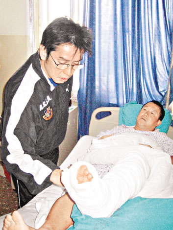 “香港明星足球隊(duì)”前日與“中國(guó)明星足球隊(duì)”于北京進(jìn)行友誼賽,結(jié)果落敗之余,志偉及張兆輝更受傷收?qǐng)觯緜ケ粚?duì)方隊(duì)員踢中左腳,痛得未能站起來(lái),最后要用擔(dān)架抬離現(xiàn)場(chǎng),隨即送院治理,經(jīng)醫(yī)生診斷后需馬上進(jìn)行手術(shù),幸好一切順利,據(jù)其主診醫(yī)生透露,志偉傷勢(shì)并不嚴(yán)重,大約休息七天,待完全康復(fù)后更可繼續(xù)踢球。
