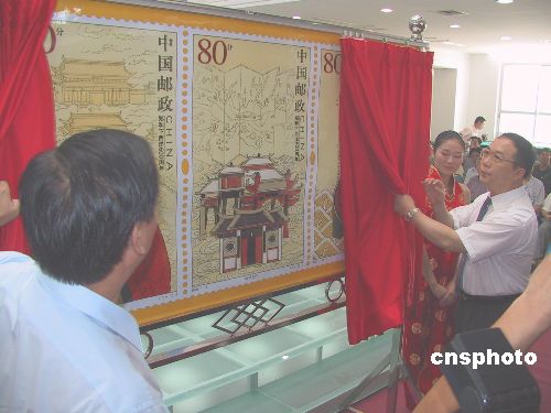 | 六月二十八日,《鄭和下西洋六百周年》紀(jì)念郵票首發(fā)式在福建長樂隆重舉行,該紀(jì)念郵票首發(fā)式共發(fā)行一套包括三枚郵票小版張及一套郵票小型張,其主題是“熱愛祖國、睦鄰友好、科學(xué)航!。圖為首發(fā)式上國家郵政總局副局長張亞非(圖右)為紀(jì)念郵票揭幕。作者:王東明