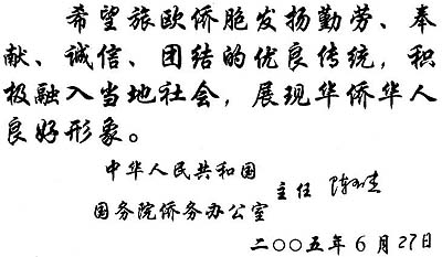 陳玉杰在《歐洲時報》題詞向旅歐僑胞致意(圖)