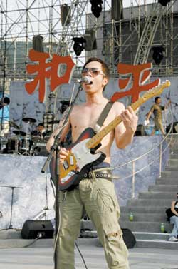 作為本場(chǎng)演出惟一的港臺(tái)歌手,黃貫中即將演唱的《游擊隊(duì)之歌》格外引人注目。昨天,在場(chǎng)的觀眾終于見(jiàn)識(shí)了這支搖滾版的《游擊隊(duì)之歌》。為了讓自己的彩排更加盡興,黃貫中索性赤膊上陣,光著上身挎著吉他和他首次亮相的“汗”樂(lè)隊(duì)賣(mài)力地演唱。