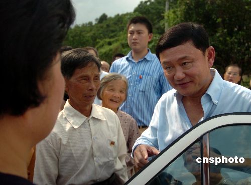 參觀完祖屋,他信總理來到客廳,并邀請年長的鄉(xiāng)親坐下來聊天。此時,鄉(xiāng)親們向他信問好的聲音此起彼伏,翻譯忙得不亦樂乎。與鄉(xiāng)親們一一招呼完畢,他信側(cè)過身來同八十六歲的表舅母丘榮秀老人親切聊天,老人雖然年事已高,但能與泰國總理坐在一起聊天,看得出來,她依然顯得十分高興。