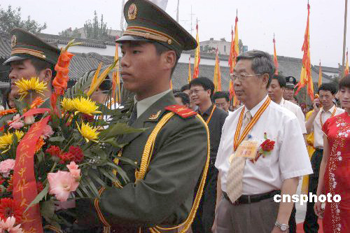 在古樂和廟內(nèi)古箏的伴奏下,參祭隊伍按順序列隊,由禮儀人員引導,全國人大常委會副委員長許嘉璐,澳門基金會行政委員吳志良、臺灣時報周刊名譽董事長簡志信等參祭人士,在兩位武警禮兵的協(xié)助下,進入廟內(nèi)敬獻花籃、行禮。