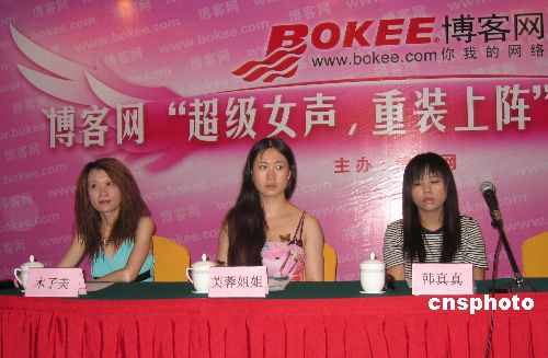 七月五日,由博客網(wǎng)主辦的“超級女聲重裝上陣”活動新聞發(fā)布會在北京舉行。備受中國內(nèi)地網(wǎng)民關注的歌手韓真真(圖右1)全程代言此次比賽。“網(wǎng)絡紅人”木子美、芙蓉姐姐、流氓燕、竹影青瞳等作為嘉賓進行全程賽況點評。