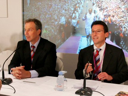 英國(guó)首相布萊爾、該國(guó)的王室成員以及足球冥想貝克漢姆等抵達(dá)新加坡,為倫敦申辦2012年奧運(yùn)會(huì)助威。圖為倫敦奧神委主席塞博-科伊(Seb Coe)與布萊爾準(zhǔn)備接受各國(guó)媒體的提問(wèn)。