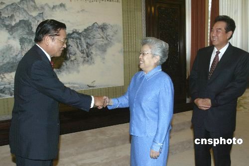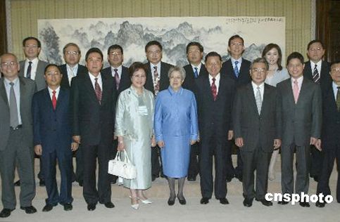 七月六日,中國(guó)國(guó)務(wù)院副總理吳儀在北京中南海會(huì)見率團(tuán)來(lái)京參加“海峽兩岸信息產(chǎn)業(yè)技術(shù)標(biāo)準(zhǔn)論壇”的華聚產(chǎn)業(yè)共同標(biāo)準(zhǔn)推進(jìn)基金會(huì)董事長(zhǎng)江丙坤,并與訪問(wèn)團(tuán)一行合影。中共中央臺(tái)辦主任陳云林出席會(huì)見。作者:史利