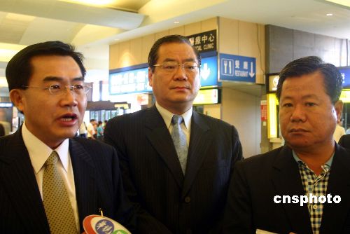 七月七日上午,國民黨“立委”李全教(左一)與國民黨中央政策會執(zhí)行長曾永權(中)、親民黨“立委”蔡勝佳(右一)在桃園機場接受采訪,介紹八日將在北京就臺灣水果登陸細節(jié)舉行的協(xié)商會議。作者:劉舒凌