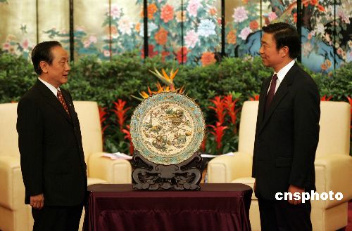 李源潮向新黨大陸訪問團(tuán)贈(zèng)送了兩件禮物,一件是云錦“金絲盤龍”,另一件是金箔制作的《論語》。郁慕明贈(zèng)送給江蘇的仍舊是一個(gè)交趾燒陶盤,主題是“祥獅獻(xiàn)瑞”,寓意團(tuán)圓和緣分。