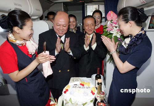 七月十日,南航機(jī)組人員在臺(tái)灣新黨“民族之旅”訪問(wèn)團(tuán)從大連飛往北京的途中,送上蛋糕,祝賀新黨秘書(shū)長(zhǎng)李勝峰(左二)生日快樂(lè),并祝訪問(wèn)成功。作者:毛建軍