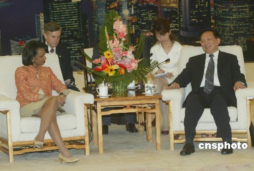 七月十日,中國國務(wù)委員唐家璇在北京人民大會堂會見來訪的美國國務(wù)卿賴斯。作者:史利
