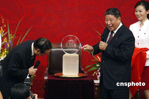 這三件禮物包括:一、水晶制作的中國人民大學(xué)標(biāo)識(shí)。標(biāo)識(shí)牌以水晶為主要材質(zhì),內(nèi)以激光雕刻人大標(biāo)識(shí),底座正面上部雕刻“人民、人本、人文”,下部雕刻:“新黨主席郁慕明先生中國人民大學(xué)演講紀(jì)念二00五年七月十二日”。