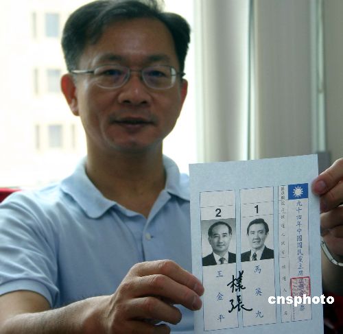 七月十三日,二00五年中國國民黨主席選舉選票印制完畢并封存于該黨中央黨部。圖為國民黨組織經(jīng)營部主任黃重憲展示選票樣張。作者:劉舒凌
