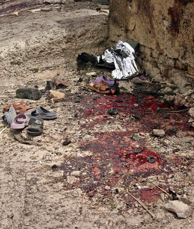 中新網(wǎng)7月14日電 據(jù)路透社報(bào)道,7月13日,巴格達(dá)發(fā)生一起汽車(chē)自殺炸彈爆炸事件,造成至少25人喪生,25人受傷,死者中包括許多兒童。圖為炸彈襲擊后,巴格達(dá)的街道上遺留的血跡和鞋子。(春風(fēng))