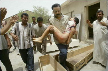 中新網(wǎng)7月14日電 據(jù)法新社報道,一名自殺式汽車爆炸襲擊者七月十三日在美軍士兵向伊拉克兒童發(fā)放巧克力時發(fā)動了襲擊,爆炸造成二十四名伊拉克兒童喪生。圖為在巴格達一家醫(yī)院太平間外扛著兄弟尸體的伊拉克人。(春風)