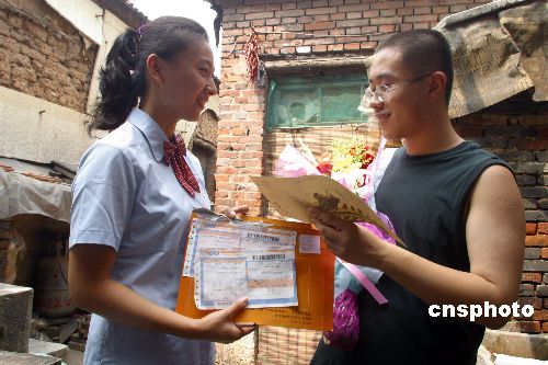 7月15日上午,家住濟(jì)南市經(jīng)四路131號(hào)小巷平房的高考考生唐寅,收到了濟(jì)南市郵政速遞局送到的中央民族大學(xué)錄取通知書,同時(shí)速遞員還送給他一束鮮花表示祝賀。據(jù)山東省郵政部門介紹,這是山東省考生收到的第一份05年錄取通知書。據(jù)濟(jì)南郵政速遞局表示,錄取通知將在此后幾天陸續(xù)到達(dá)。作者:周青先