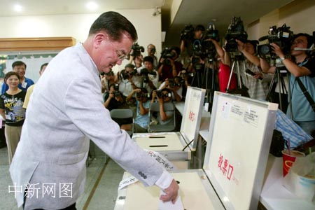 7月16日,中國(guó)國(guó)民黨主席選舉在全臺(tái)601個(gè)投票所展開,F(xiàn)任國(guó)民黨主席在居家附近的臺(tái)北復(fù)興中小學(xué)參加投票。中新社記者 盛佳鵬