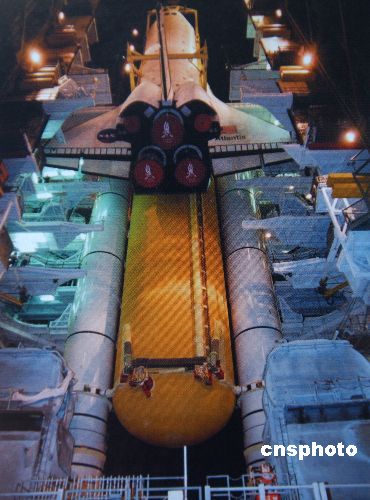 美國航天飛機“發(fā)現(xiàn)號”七月十六日仍在肯尼迪航天中心解決燃料傳感器故障,故障一旦解決,就重新啟動四天的發(fā)射倒計時。(美國太空總署供圖)