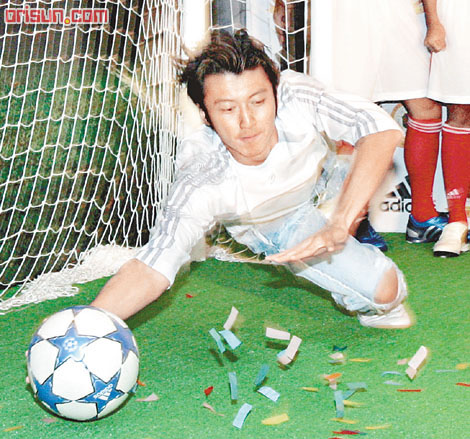 中新網(wǎng)7月19日電 據(jù)香港媒體報(bào)道,謝霆鋒昨日在灣仔出席某活動(dòng),同場(chǎng)還有將于本月底迎戰(zhàn)“紅魔”曼聯(lián)的港隊(duì)球員,雖然霆鋒手腳舊患仍未痊愈,但他仍到場(chǎng)做守門(mén)員,更不惜飛身?yè)踅馗坳?duì)球員的射球,背脊還撞向門(mén)柱,結(jié)果成功阻截港隊(duì)射球,表現(xiàn)相當(dāng)賣(mài)力。