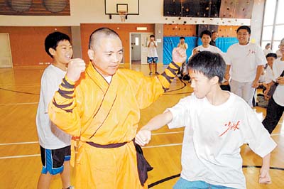 為期三天兩夜的訓(xùn)練營,由香港青年協(xié)會(huì)及香港少林武術(shù)文化中心合辦,并禮聘少林“易筋經(jīng)”、“洗髓經(jīng)”第34代傳人釋延王禪師及其三位弟子釋恒彪、釋恒超、釋恒印,向百名青少年傳授“八步連環(huán)拳”。少林武僧更是即席示范“鐵布衫”、“鐵頭功”、“金剛腿”、“虎拳”、“地堂羅漢拳”、“通臂拳”,還有傳統(tǒng)少林刀法及棍法,舞得虎虎生威,令人驚嘆不已。此外,釋延王禪師也向青少年簡(jiǎn)介易筋洗髓的入門練氣之法。