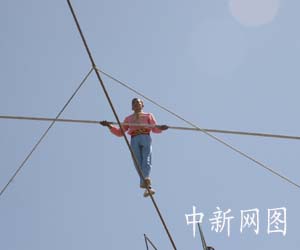 20日中午,16歲的男孩買合蘇正在20米高的空中表演達(dá)瓦孜,引發(fā)記者團(tuán)的陣陣掌聲。英吉沙縣正在建設(shè)一座達(dá)瓦孜學(xué)校,建成后將會(huì)招收全國(guó)各地的學(xué)員。