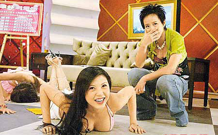 女F4隊(duì)長Fanny(中)做掌上壓時(shí)受F cup上圍所累,顯得上氣不接下氣,隊(duì)友(后)更做到趴地,令主持李明依(右)笑不攏嘴。